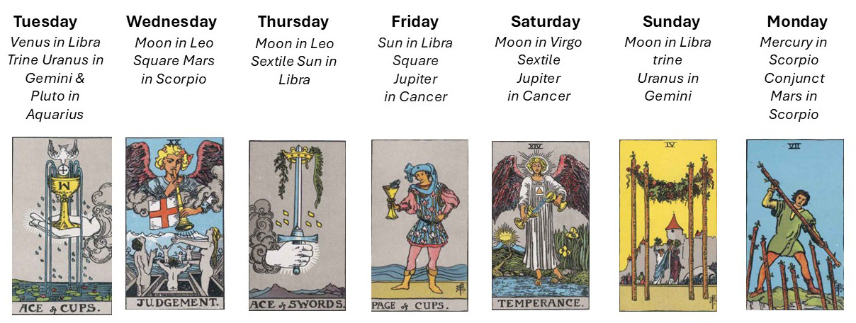 The numerology and elemental rhythm of the week reveal a movement from creation to consolidation. Two Aces mark beginnings—one of the heart, one of the mind—showing that new emotional and intellectual cycles are unfolding simultaneously.