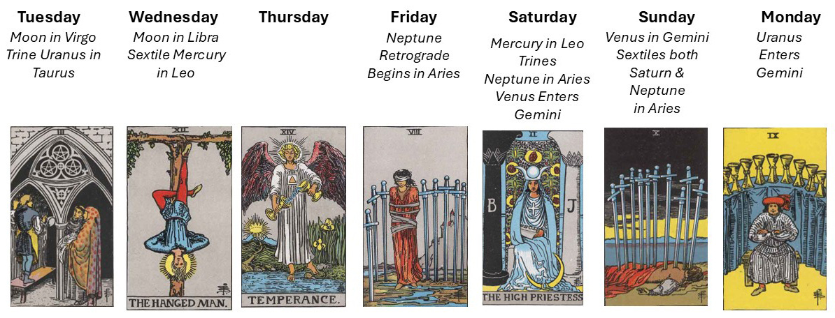 This week’s seven-day spread lays out as follows: Tuesday carries the Three of Pentacles with the Moon in Virgo trine Uranus in Taurus. Wednesday brings the Hanged Man as the Moon in Libra sextiles Mercury in Leo. Thursday arrives with Temperance balancing the middle of the week. Friday unfolds as the Eight of Swords while Neptune turns retrograde in Aries and Venus steps into Gemini. Saturday opens the veil with the High Priestess, accompanied by the Moon in Scorpio trine the Sun in Cancer. Sunday delivers the Ten of Swords beneath a Venus in Gemini sextile to both Saturn and Neptune in Aries. Monday rounds everything out with the Nine of Cups as Uranus crosses into Gemini.