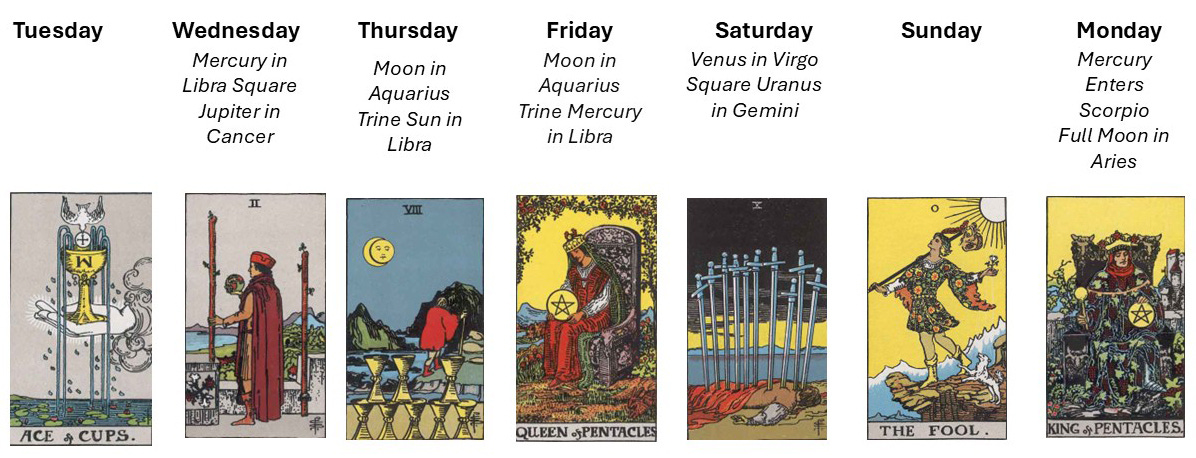 The week closes with the King of Pentacles, under the Aries Full Moon as Mercury enters Scorpio. Here is mastery, security, and tangible results. The King is the culmination of steady labor and practical wisdom. After the openness of The Fool, he reminds you to anchor your vision in reality. He represents success built on responsibility and foresight. This card affirms that the choices, departures, and endings of the week all lead toward solid ground and stability.