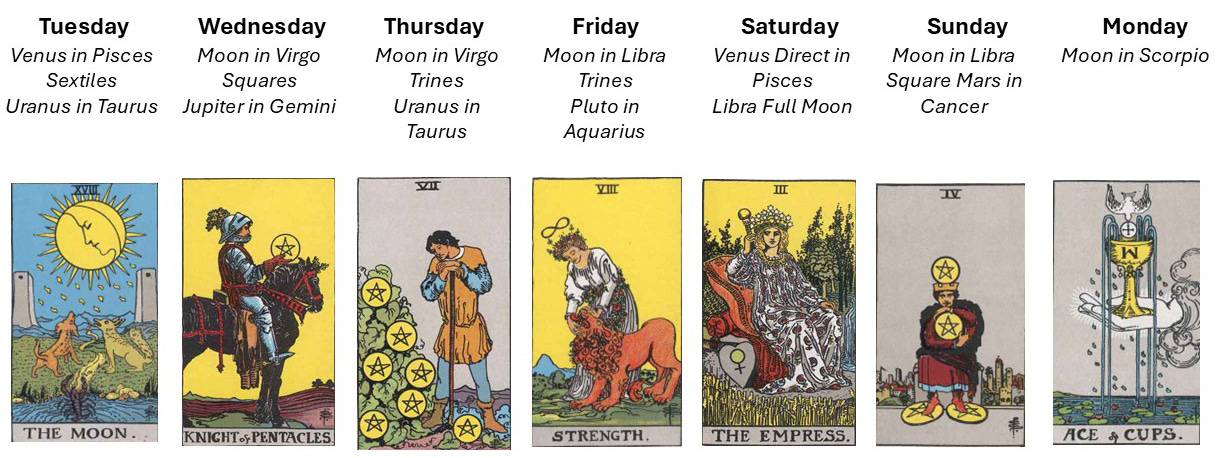 This is a reading for the energetic influences at play for the week of April 8-14, 2025. Starting the week on Tuesday, I drew Tuesday’s card, The Moon, as Venus in Pisces Sextile Uranus in Taurus. Wednesday's card was the Knight of Pentacles as the Moon in Virgo Square Jupiter in Gemini. Thursday's card was 7 of Pentacles as the Moon in Virgo Trine Uranus in Taurus. Friday's card was the Strength as Moon in Libra Trine Pluto in Aquarius. Saturday's card was The Empress as Venus goes Direct in Pisces and a Libra Full Moon. Sunday's card was 4 of Pentacles as Moon in Libra Square Mars in Cancer. Finally, Monday's card was the Ace of Cups as the Moon is in Scorpio. There are no wands or swords, and there are 3 pentacles as well as 3 majors, with a recurring Empress and Strength cards in this 7-card reading. Venus turns direct in Pisces with a full Libra moon, Neptune in Aries and Aquarius in Pluto.