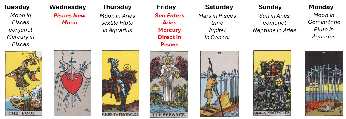 This week opens at a threshold and closes at a floor. The astrological weather is doing serious structural work: a Pisces New Moon wipes the emotional slate, Mercury stations direct and begins moving information forward again, and the Sun crosses into Aries, ending the zodiacal year and beginning a new one. Against that backdrop, your cards this week are not asking you to reflect. They are asking you to move, even when moving feels counterintuitive, even when the direction is unclear, and even when what you are leaving behind still has its hooks in you. Pay attention to what is ending and what is beginning; this week, those two things are happening simultaneously.
