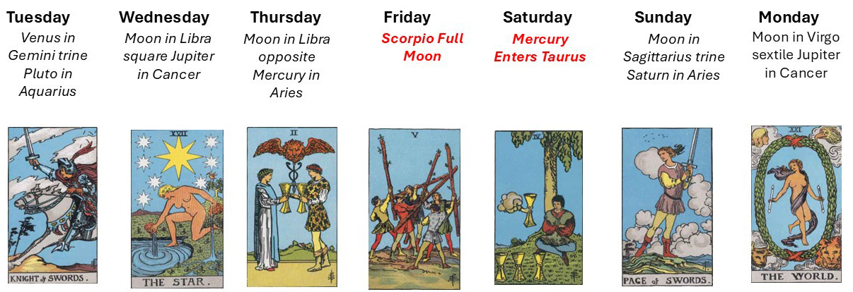 This week carries two Major Arcana, two court cards, and a spread that shares one striking visual quality: not a single card looks directly at you. The Knight of Swords, The Star, the 2 of Cups, the 5 of Wands, the 4 of Cups, the Page of Swords, and The World are all absorbed in their own business, their own relationships, their own interior weather. This is not a week that performs for your observation; it is a week that asks you to observe yourself. The Scorpio Full Moon and Mercury's ingress to Taurus are the dominant astrological forces, with the Sun already settled in Taurus and the Aries stellium thinning but present. Something is completing, and something is slowing down enough to be felt.