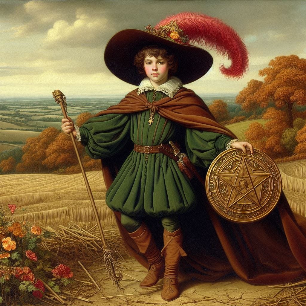 This is exactly the Page's moment: young, attentive, standing at the edge of what she has carefully studied, feeling the season pull her forward into something larger than study alone. She has held the pentacle long enough. The Knight's energy is rising in her, the way sap rises without apology.