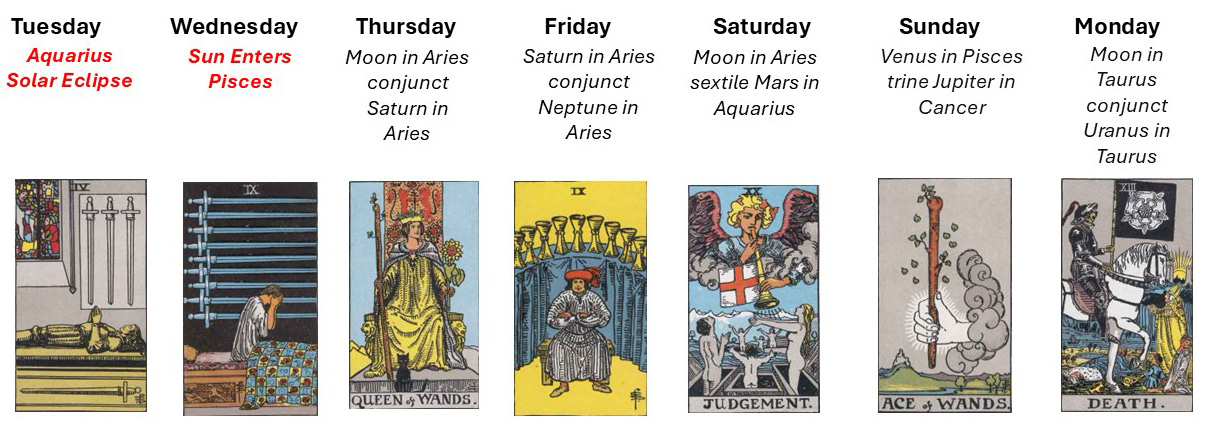 This week centers on awakening through release. The eclipse initiates reflection, while the Sun’s movement into Pisces deepens emotional awareness. Fear and doubt appear early, but they serve as gateways rather than barriers. As the week progresses, clarity strengthens, culminating in decisive transformation. You are moving from rest into renewal, from uncertainty into alignment. The presence of Judgement and Death confirms that this is not a temporary shift. It is a permanent evolution in how you understand yourself and your path.