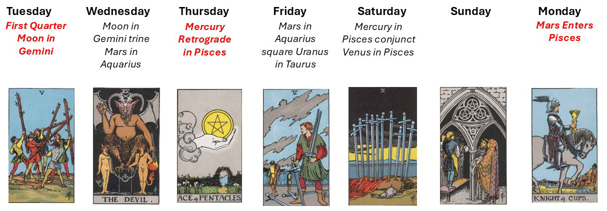 The week begins with tension that cannot be ignored. The 5 of Wands shows movement without resolution. Each figure is occupied with their own effort, unaware of the larger pattern forming around them. The First Quarter Moon in Gemini amplifies mental activity and conversation, but not necessarily agreement. You may encounter competing ideas, competing demands, or competing versions of truth. This is not chaos without meaning. It is a testing ground. You are learning how to hold your position without losing your center.