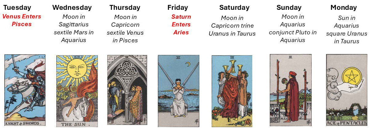 This week centers on conscious engagement rather than passive waiting. Decisions are forming beneath the surface even when they are not yet spoken. Venus in Pisces invites compassion, while Saturn in Aries demands accountability. The presence of The Sun emphasizes clarity through action, not avoidance. You are being asked to participate actively in shaping your direction while honoring emotional truth and practical limits.