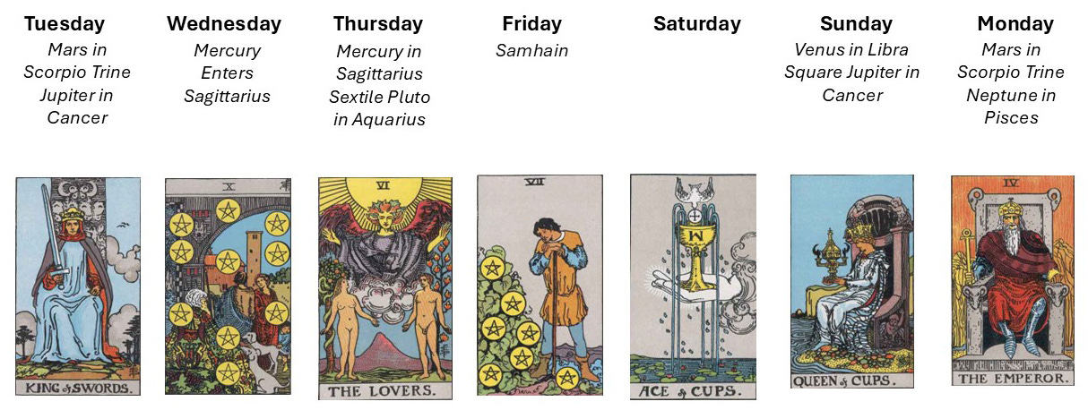 At Samhain’s threshold, you stand between past and future. The ancestors watch as you balance inheritance and intention, passion and prudence. The King of Swords and The Emperor bookend this week like marble statues, reminders that wisdom must serve both heart and order. Within their gaze, the Queen of Cups teaches compassion and the Ace of Cups restores faith. You are asked to lead with clarity, to build with care, and to remember that every act of power is also an act of stewardship.